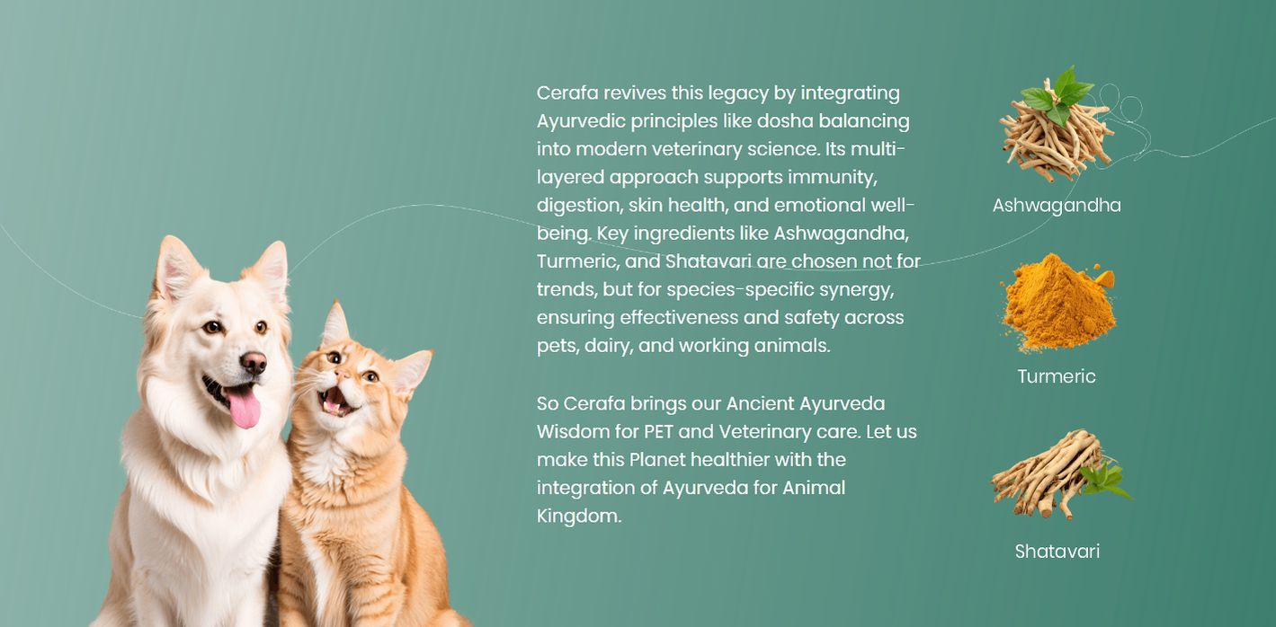 Cerafa revives this legacy by integrating Ayurvedic principles like dosha balancing into modern veterinary science. Its multi-layered approach supports immunity, digestion, skin health, and emotional well-being. Key ingredients like Ashwagandha, Turmeric, and Shatavari are chosen not for trends, but for species-specific synergy, ensuring effectiveness and safety across pets, dairy, and working animals.
